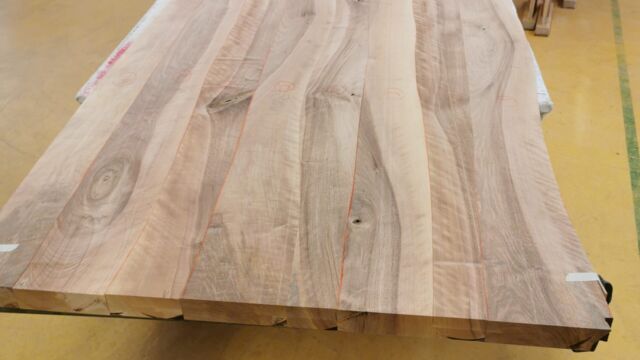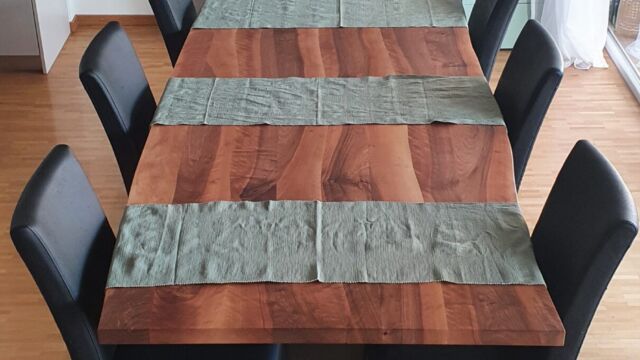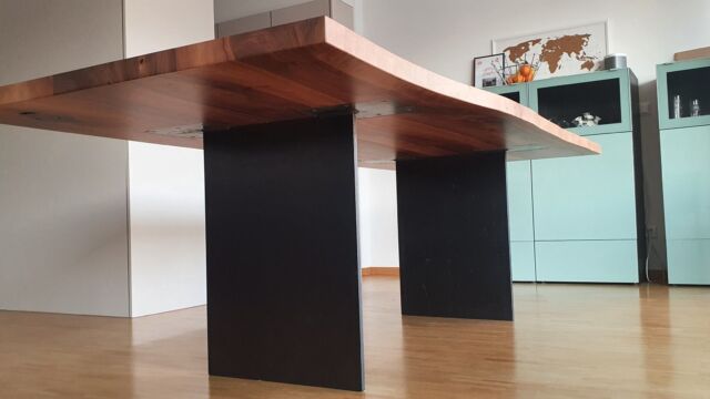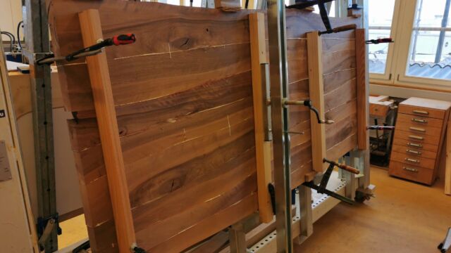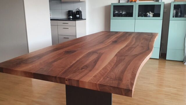 Im Rahmen eines Hochzeitsgeschenks hat sich ein Mitarbeitender einen massiven Bogengut-Tisch von der Koster AG Holzwelten schreinern lassen.