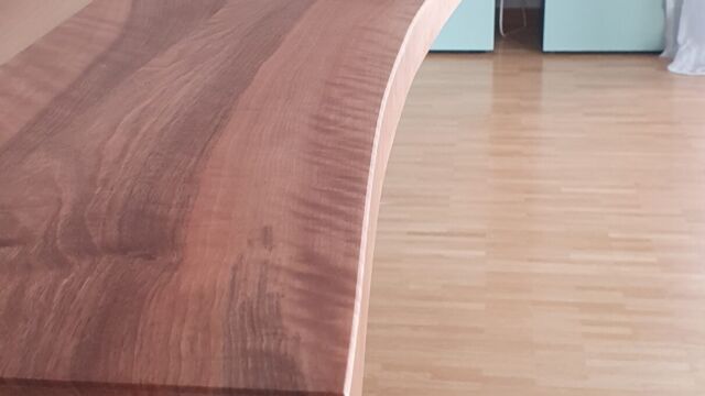 Die Holzwahl fiel auf europäischen Nussbaum mit markantem Kern- und Rotanteil, was durch die farblichen Hell- und Dunkeltöne für ein spannendes Endergebnis spricht.