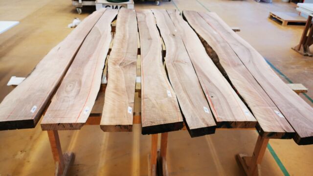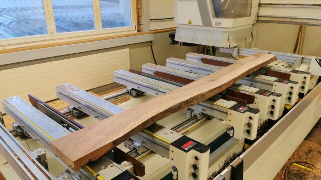 Die rohen Holzbretter wurden für eine Erstbestimmung in der gewünschten Anordnung ausgelegt. Anschliessend erfolgte die Besprechung mit dem CNC- Maschinisten, der die Bretter entsprechend bezeichnete.
