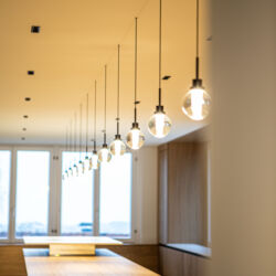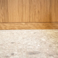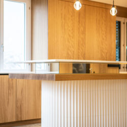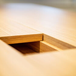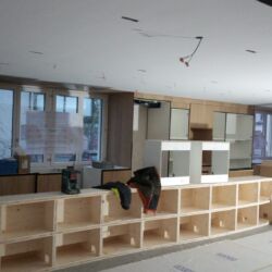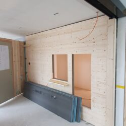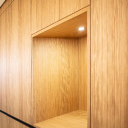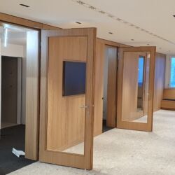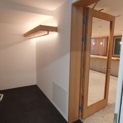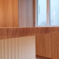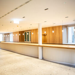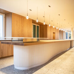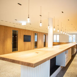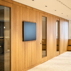 Koster AG Holzwelten hat kräftig an der Neugestaltung mitgewirkt und war für die Wandbekleidungen mit Schrankfronten, Nischen-Ablagen aus Mineralwerkstoff, eine Türe mit Brandschutz-EI30 und Fluchtweganforderung sowie für eine Türe mit erhöhter Schallanforderung, eine Garderobe, das Grundgerüst der Beratertheke, ein Sideboard und ein Besprechungstischchen verantwortlich. Für die Kühlungs-, Lüftungsgerät-, und Elektroinstallationsanschlüsse, die sich in den Wandschränken befinden, wurde mit den zuständigen Gewerken und der Bauleitung sehr gut zusammengearbeitet. Der Innenausbau ist in Natur lackierter Eiche ausgeführt und hochwertig verarbeitet worden.