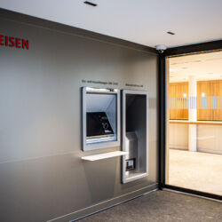 Die alte Schalterhalle der Raiffeisenbank Regio St. Gallen West ist kaum wiederzuerkennen. Wo einst Kundenschalter standen, ladet heute eine massive Stehtheke für Beratungsgespräche in wohligem Ambiente ein. Die Halle wurde zum Beratungszentrum umgestaltet, wobei die Theke unweigerlich zum Blickfang wird, denn mit ihrer stattlichen 13 Meter Länge füllt sie beinahe die ganze Raumlänge aus.
