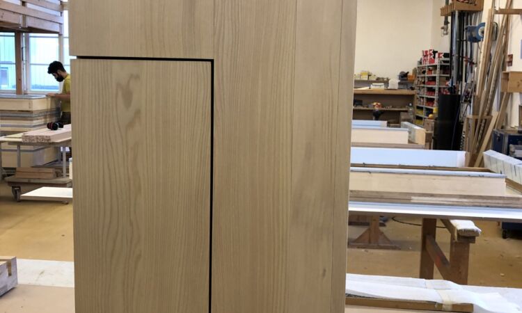 Nach Massaufnahme sämtlicher relevanter Geschosse, bekam unser technischer Planer für die Detailpläne grünes Licht vom Architekturbüro Kim Strebel Architekten GmbH. Mit der Freigabe der Produktionspläne, konnte die erste Etappe der Werkstücke bestellt und von unseren Fachleuten in der Produktionsstätte weiterverarbeitet werden. Auf einer Abbildung ist ein vorgefertigtes Muster aus Weisstanne mit einem schwarzen Sturz sichtbar, das als Tür- und Festverglasungsimitat für das Gut zur Ausführung diente.