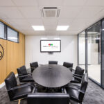 Für die Ausführung der Wände verwendeten unsere Fachleute feco-Systemtrennwände als geschlossene Vollwand. Als Verglasung setzten wir fecofix Glaselemente mit wandbündiger Doppelverglasung und einem 20mm Aluminiumrahmen ein. Das Ergebnis sind drei moderne Räume, die ästhetisch überzeugen. Funktionell gewähren sie mit einem 47dB- Schalldämmwert lärmfreies Schaffen.