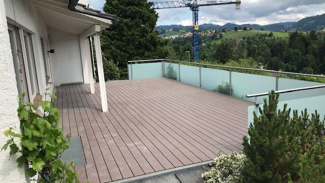 Im Beispiel der abgebildeten Fotos hat die Koster AG Holzwelten im Mai eine grossflächige Terrasse in Niederteufen erneuert. Dabei wurde der alte Rost in Lärchenholz fachgerecht demontiert, damit anschliessend das neue Exemplar in widerstandsfähigen Megawood Dielen auf die bestehende Stahl- Unterkonstruktion angebracht werden konnte. Der neue Terrassenboden erscheint im gepflegten braun-grauen Farbton, was farblich gut zum Milchglas Geländer passt.