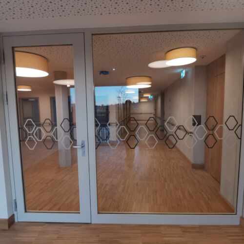 Die Koster AG Holzwelten war am Neubau beteiligt und verbaute verteilt auf zwei Innenhöfe 170 Stück Festverglasungen in farblackiertem Eichenholz mit Brüstungselement und Sichtschutz, die den EI30 Anforderungen gerecht werden. Unsere Fachleute fertigten und montierten zudem 43 Stück ein- und zwei- flügelige Brandschutz konforme EI30 Türen in furnierter Eiche sowie einigen in farblackierter Ausführung. Die meisten weisen Glas auf, teilweise sind sie mit Seitenverglasung versehen. Die Türrahmen reichen in der Höhe von 2.20 Meter bis 3.15 Meter. In der Breite sind sie 1.0 Meter bis 5.55 Meter geschnitten. Allfälligen Gebäudesenkungen wurde mehrheitlich mit gleitenden Türenanschlüssen, die beim Absinken bis zu 2.5 cm Differenz aufnehmen können, entgegengewirkt. Die Oberteilkomponenten wurden teilweise in EI60 Anforderungen mit gleitendem Anschluss ausgeführt.