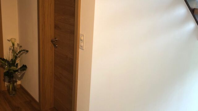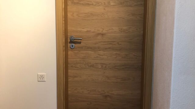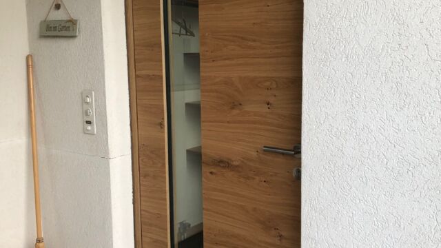 Bei einem 45-jährigen Einfamilienhaus wurde anlässlich einer Sanierung des Treppenhauses und des Eingangsbereiches die Hauseingangstüre ersetzt. Zum Design des Parkett-Bodens passend stellte die Koster AG Holzwelten ein neues Türelement in Eiche rustikal mit vertikaler Holzverlauf her.