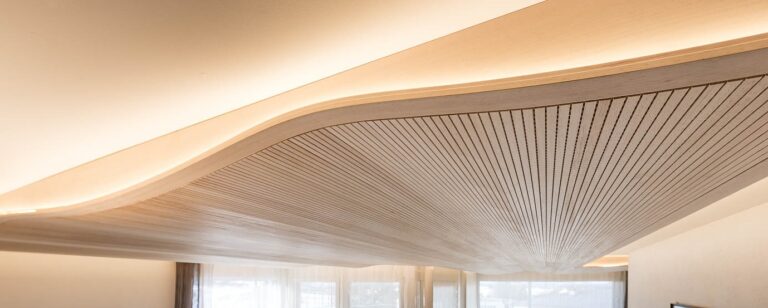 Nach dem Aufschneiden und Trocknen wurden die Bretter speziell für die Deckenverkleidung bearbeitet. Feine Bohrungen, welche zusätzlich mit Vlies kaschiert und mit Schafwolle gedämmt wurden, sorgen für eine wirksame Schallabsorption. Die wellenförmige Gestaltung wurde zusätzlich mit einer indirekten Beleuchtung ergänzt.