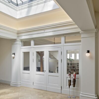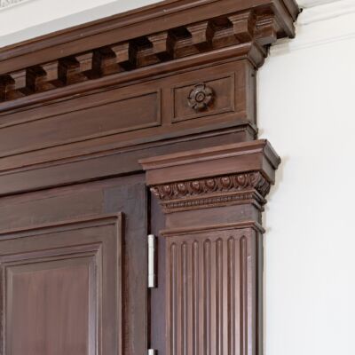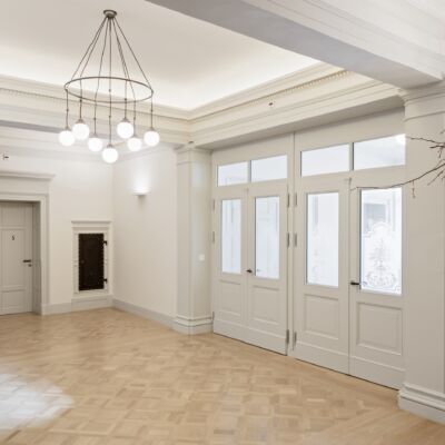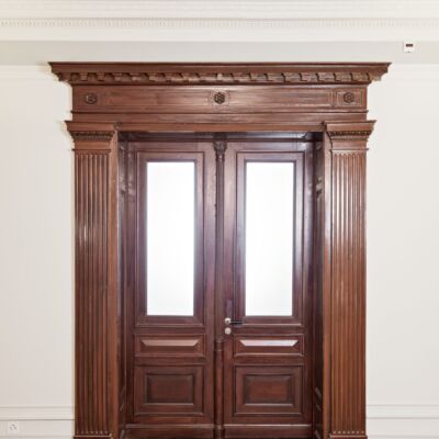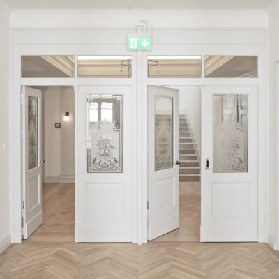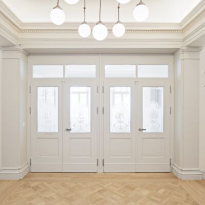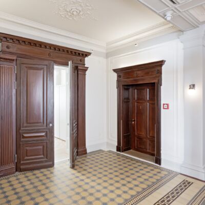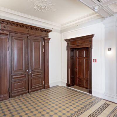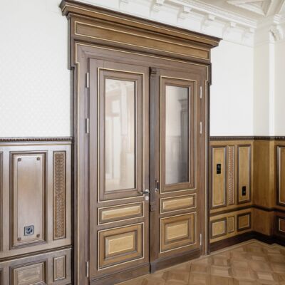 Denkmalgeschützte Objekte bringen besondere Anforderungen mit sich; so müssen historische Türelemente optisch zum Altbestand passen. In öffentlichen Gebäuden gilt es ausserdem, geltende Brandschutz- und Fluchtwegbestimmungen einzuhalten. Diese Sicherheitsfunktionen können entweder in einem Nachbau oder wie in diesem Fall im Zuge einer Wiederherstellung und Renovation der Originaltüren integriert werden. Sorgfältig wurden die bestehenden Tür-und Verkleidungselemente demontiert und in der Werkstatt aufgetrennt sowie mittels speziellen Brandschutzmittellagen wieder neu aufgebaut, sodass ein nachhaltiges, den hohen Anforderungen entsprechendes Ergebnis entstand. Die aussagekräftigen Bilder verdeutlichen, dass sich der grosse Einsatz der Koster AG Holzwelten gelohnt hat, um damit beizutragen, die prächtigen, detailreichen Bausubstanzen in neuem Glanz erstrahlen zu lassen.