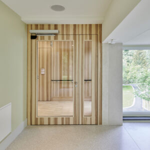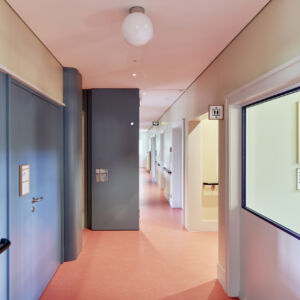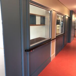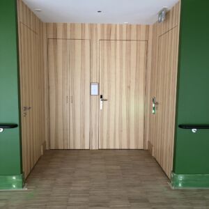 Im alten Gebäudeteil war die Herausforderung, die bestehenden historisch geschützten Türen auf die neuen Zutrittskontrollsysteme umzurüsten. Damit verbunden waren zahlreiche Kabelführungen in den Türelementen als auch innerhalb des Gebäudes. Diese Arbeiten wurden in Zusammenarbeit mit der Fachplanung abgeklärt und durchgeführt. Ein Teil der historischen Türen wurde auf das neue Zutrittskontrollsystem der Firma Dormakaba umgestellt. Nebst den historischen Türen wurden weitere 165 neue Elemente grundiert geliefert, damit der Maler vor Ort die gewünschte historische Pinselstrichoptik sowie den alten Charakter wieder herstellen konnte.