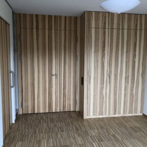 Für den Neubau wünschte die Bauherrschaft, dass die natürliche Holzstruktur zum Ausdruck kommt. Dafür wurde für die Ausführung eine charakterstarke, lebendige Esche mit Braunkern ausgewählt. Insgesamt sind 125 Elemente verbaut worden.