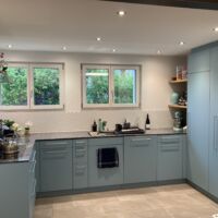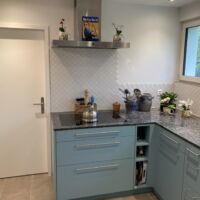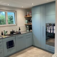 Im ganzen Haus wurden die ausgedienten Fenster ausgewechselt. Der Eingangsbereich hat eine neue Türe, mit diskreterem Glaseinsatz und einer farblichen Abstimmung zur neuen Küche erhalten. Mit den hellen Bodenplatten gewinnt der Eingangsbereich an Freundlichkeit und wirkt dadurch gesamtheitlich moderner. Die komplett erneuerte Küche im Farbton Pacific wirkt zeitlos frisch. Sie schafft mit dem vergrösserten Durchbruch zum Esszimmer einen offenen Bereich, mit einer grosszügigen kombinierten Arbeits- und Tischfläche, die sofort Lust auf Kaffee trinken und Kuchen essen aufkeimen lässt. Auch das Badezimmer wurde auf den neusten Stand gebracht.