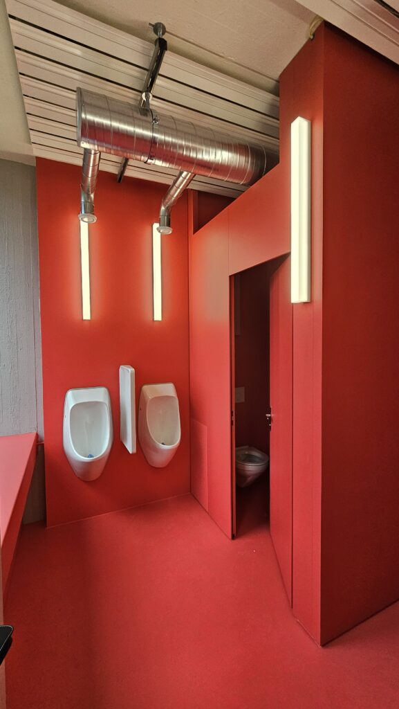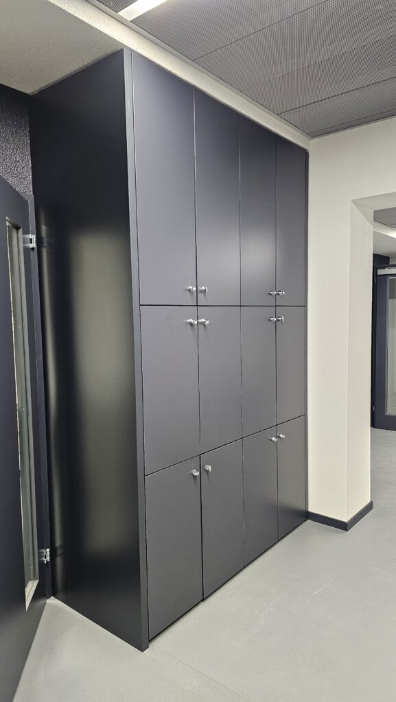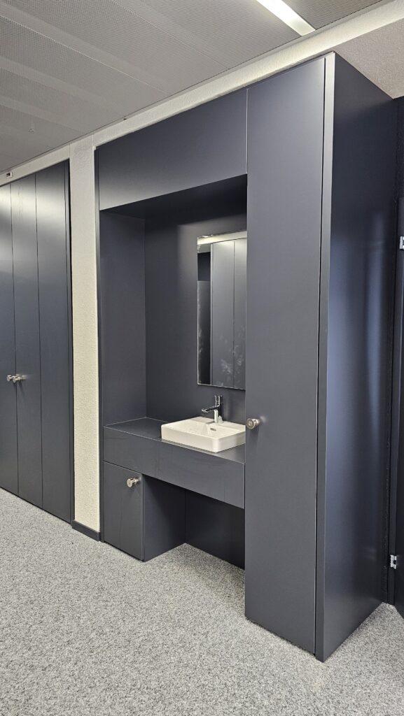 Unsere Arbeit begann mit der sorgfältigen Demontage und Zwischenlagerung der bestehenden Fronten. Anschliessend wurden diese aufgearbeitet, brandschutztechnisch ertüchtigt und in Rolloptik neu gestrichen. Neben den Schrankfronten durften wir eine WC-Anlage in Rot gestalten und die Labortische denkmalgerecht rekonstruieren.
