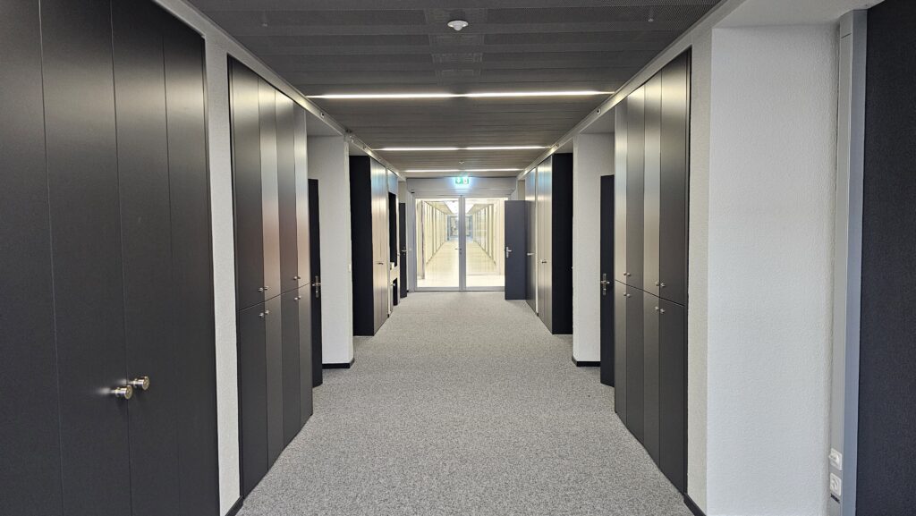 Das viergeschossige Gebäude stellte uns vor vielfältige Anforderungen: Von Bereichen ohne Brandschutzanforderungen bis hin zu EI30/60 und RF1 galt es, einheitliche optische Lösungen zu realisieren. Das Projekt wurde unter dem Minergie-ECO-Label umgesetzt, wobei die Bauherrschaft das Ziel verfolgte, möglichst viele bestehende Materialien wiederzuverwenden. Dieses Ziel konnten wir zu beeindruckenden 75 % erreichen.