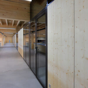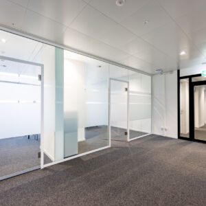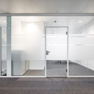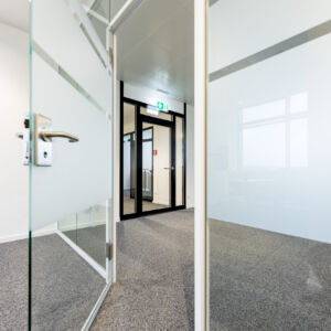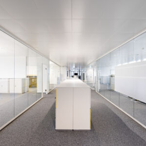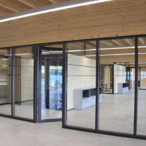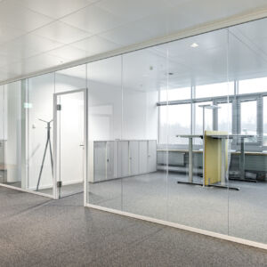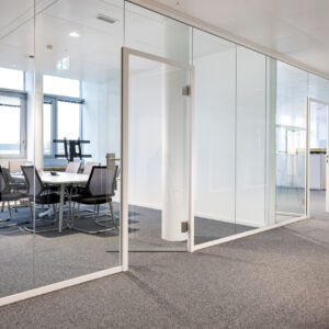 Schlanker 22 mm Aluminium rahmen mit mittiger Isolier-verglasung für Schalldämmung bis Rw,P = 42 dB und optionalen Brandschutz G30/F30. 35 mm Profile an Boden und Decke ermöglichen flexible Anschlüsse – wirtschaftlich und elegant.
